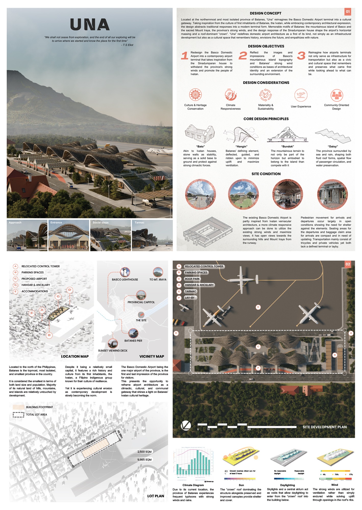 To ground the airport in reality, locally available materials are mainly used alongside preserving aspects of the existing airport. Alongside is the addition of a civic park beneath the crown serving as a public space for the community and a waiting space with an open view of the surroundings for travelers. “Una” merges ideas from the Ivatan vernacular, contemporary culture, and the environment to redefine airport architecture as a first of its kind, not simply as infrastructure but also as a cultural space that remembers history, envisions the future, and empathizes with nature.